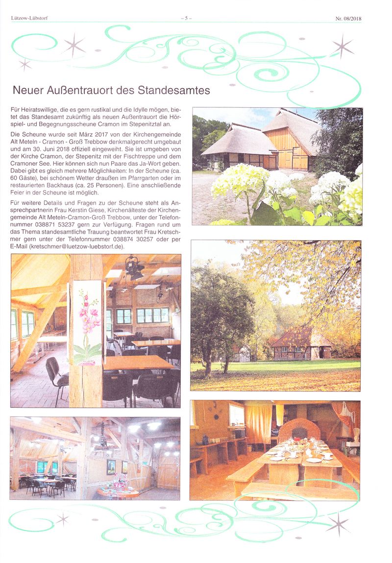Der Amtsbote "Lützow-Lübstorf" - das Öffentliche Bekanntmachungsblatt - berichtet, dass die Scheune Cramon Außenstelle des Standesamtes Lützow wird.