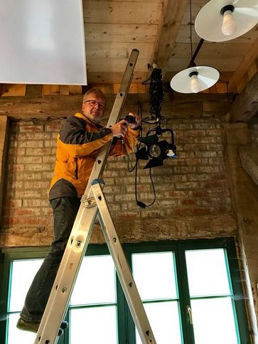 Einen besonderen "Frühjahresputz" erledigten Dirk Bethage (Förderverein) und Rainer Polzer: Sie befestigten am Nachmittag die 4 Scheinwerfer so in der Hörspielscheune, dass sie eine Bühne an der hinteren Giebelwand sehr gut ausleuchten. Als erfahrener Kameramann weiß Dirk Bethage auf Anhieb, wo die Geräte angebracht und wie sie eingestellt werden müssen. Nun ist ein weiterer Schritt für eine feine Mehrfachnutzung der Scheune erledigt.