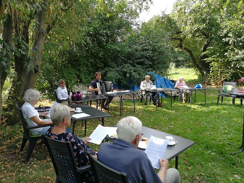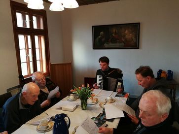 Jeden ersten Mittwoch im Monat gibt es im Pfarrhaus in Cramon den "Gemeinde-Kaffee". Zeit für besinnliche Gedanken aber auch nette Gespräche, Lieder und ein gemeinsames Gebet. Aber auch UNterfhjaltung: Heute z.B. lasen Heidi Freitag und Hannelore Rosenow aus alten Poesie-Alben vor. Hannelore Rosenow hat die Büchlein von vier Generationen: Großmutter (1893), Mutter (1924), ihr eigenes (1950) und das ihrer Tochter (1975). Das war schon ein schöner Ausflug in die Geschichte unseres Landes. Danach griff Pastor Seefeld zum Akkordeon und es wurden alte Seemannsweisen gesungen.