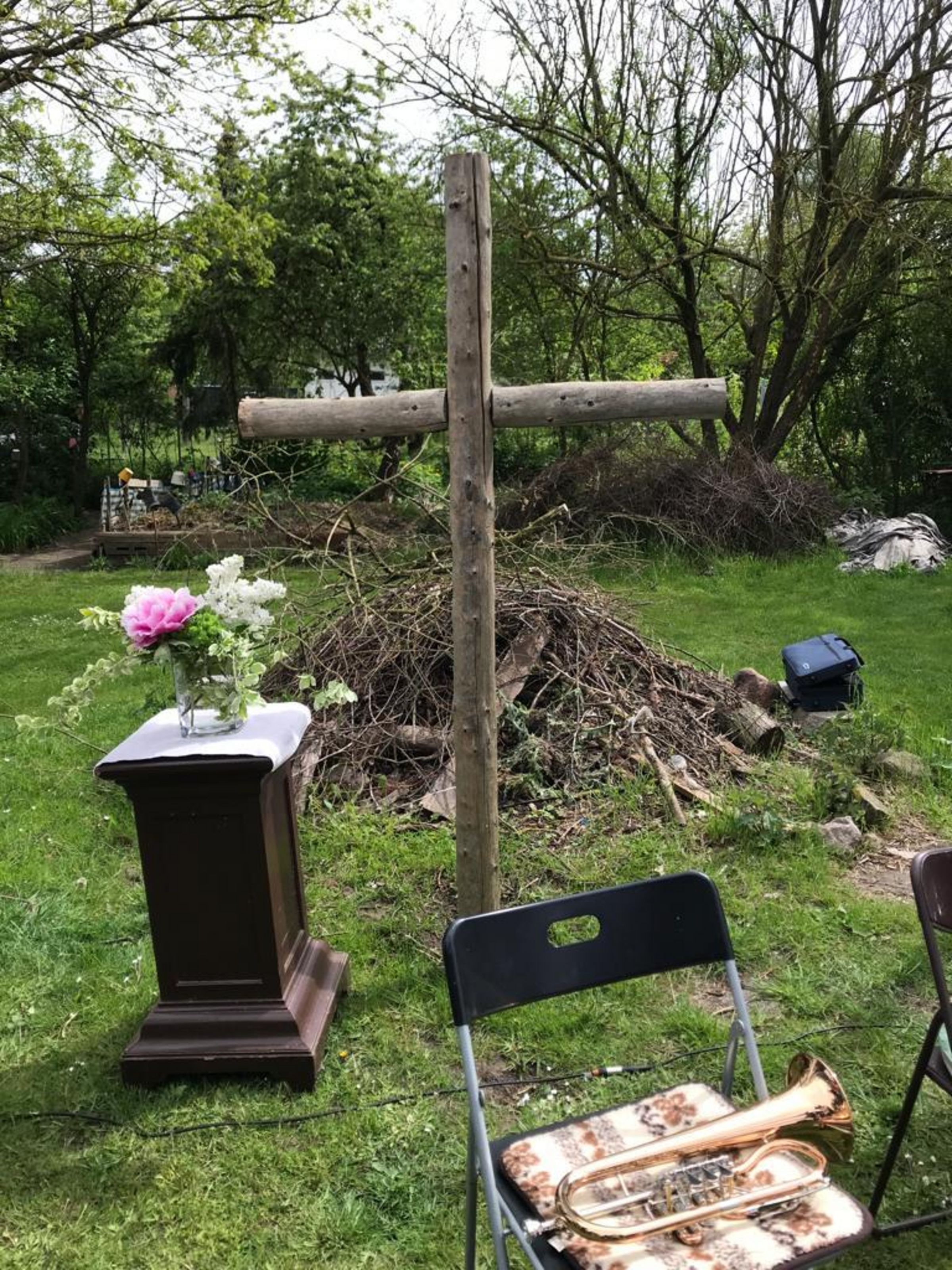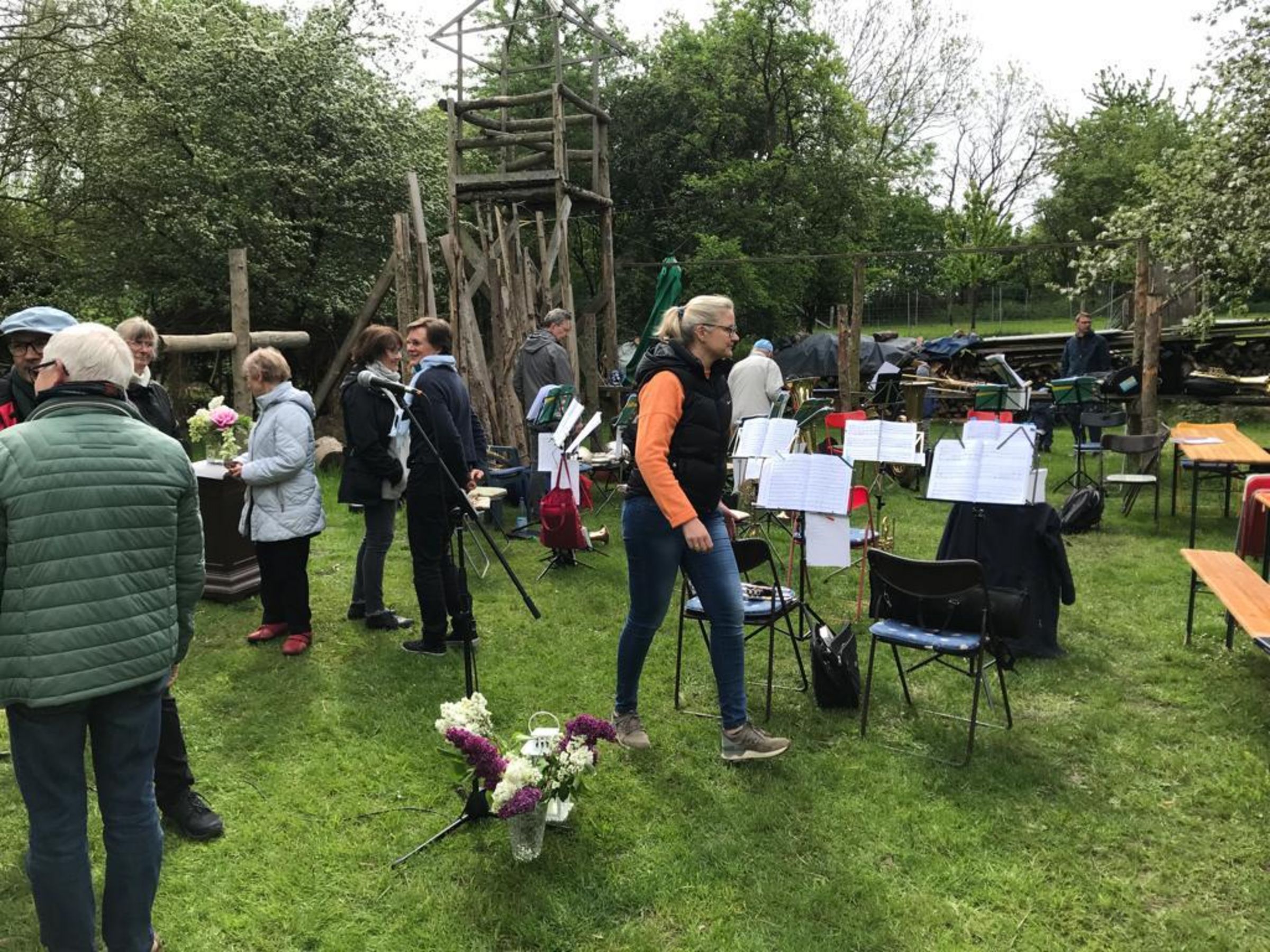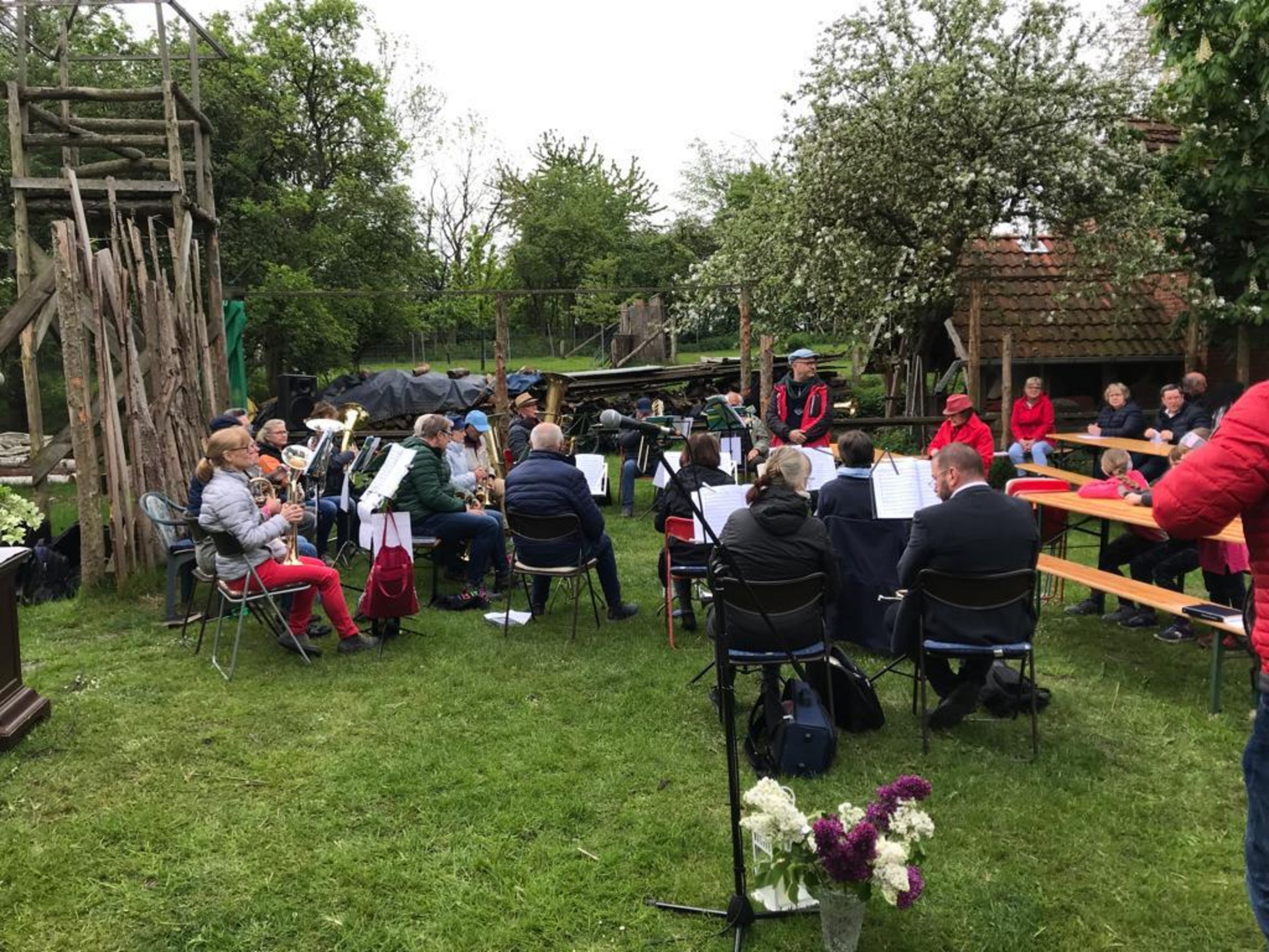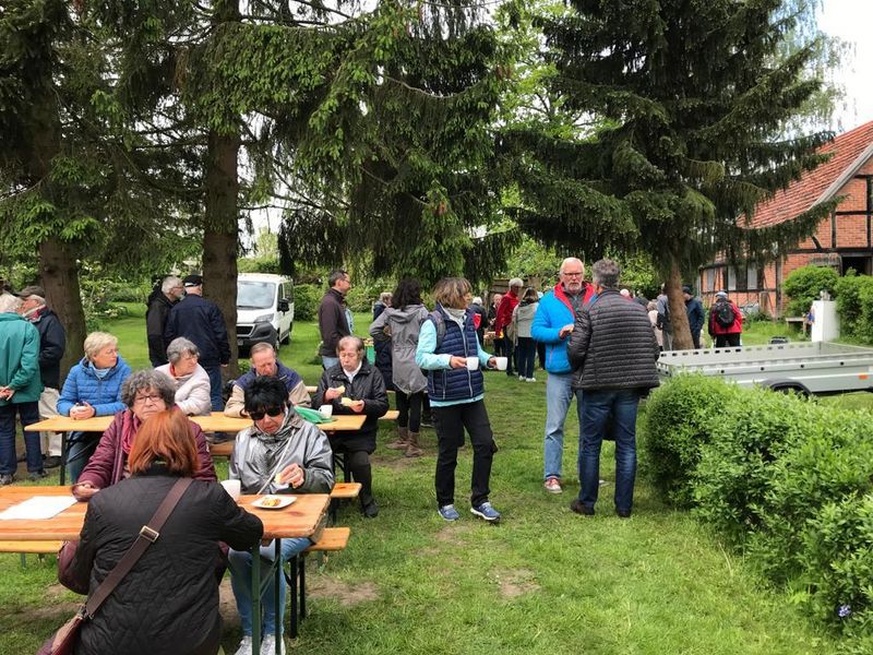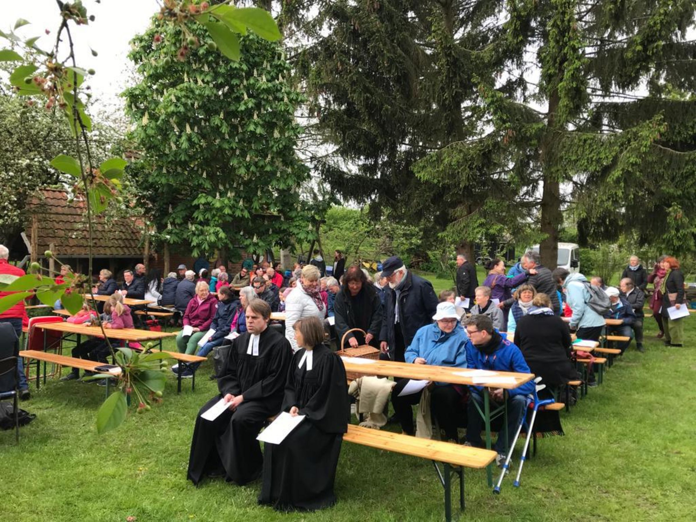 Bei herrlicher Sonne an einem etwas kühlen Maitag feierten wir wieder Himmelfarhtsgottesdienst in Groß Trebbow unter freiem Himmel. Die Friedensgemeinde aus Schwerin war zu Gast, so wie es seit Jahren schon gute Tradition ist. Die meisten von ihnen waren mit dem Fahrrad angereist. Pastorin Anne Kathrin Schenk predigte über weißen Flieder und blühende Kastanien. Sie erinnerte in ihrer Predigt daran, dass Jesus uns einlädt, Abstand vom Alltag zu bekommen und neue Kraft zu schöpfen.