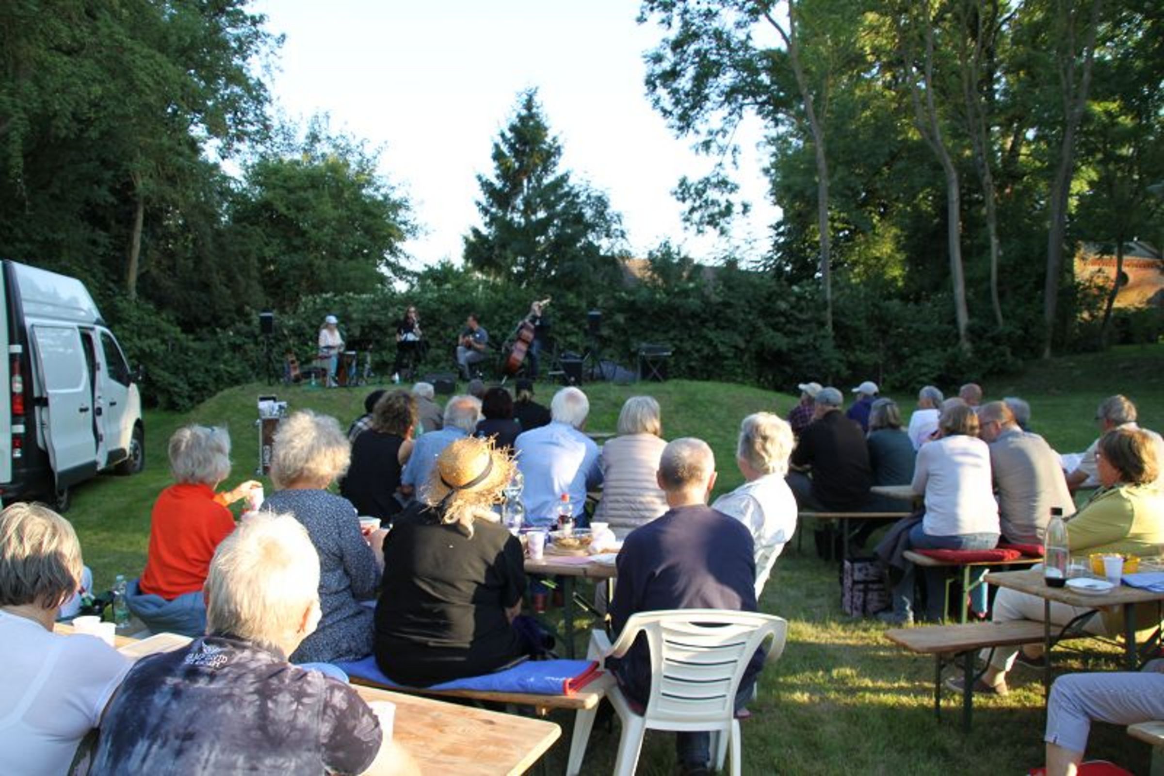 An den warmen Sommerabenden ist es doch besonders schön, draußen zu picknicken, dachte sich der Vorstand des Fördervereins Kirche Kirch Stück und luden zum Konzert mit Picknick ein. So kamen viele Besucher, die sich im Friedhofspark Kirch Stück unter den schattigen Bäumen an den Tischen oder auf Decken setzten. Dazu noch spielte die Schweriner Band „Mustard & Milk“ nach eigener Aussage nur schöne Musik. Mánu Kolditz - Hermel, Gesang und Percussion, ist eine vielseitige Musikerin aus Schwerin. Gemeinsam mit ihren Musikerkollegen Micha Bahlk, Bass, Heike Homp, Gesang und Frank Jahnke, Gitarre sind eine scharf-sanfte mecklenburgische Mischung. Die Band kam mit einem umfangreichen Repertoire wie zum Beispiel Songs von den Beatles, Pink, Neil Jung, Amy Macdonalds oder Johny Cash. Aber auch deutsche Lieder wurden gespielt, was den Gästen besonders gefiel. Die Band unter der Leitung von Mánu Kolditz - Hermel spielte zum ersten Mal in Kirch Stück. Sie selbst fanden ihre Bühne im Freien sehr schön und zwischen den angesagten Songs standen die Musiker immer mit dem Publikum im Kontakt. Man merkte es der Band an, wie viel Spaß sie am gemeinsamen Musizieren hatten. Fördervereinschef Jürgen Hansen bat um Spenden für die Verschönerung des Friedhofes. So soll die Friedhofsmauer saniert werden.