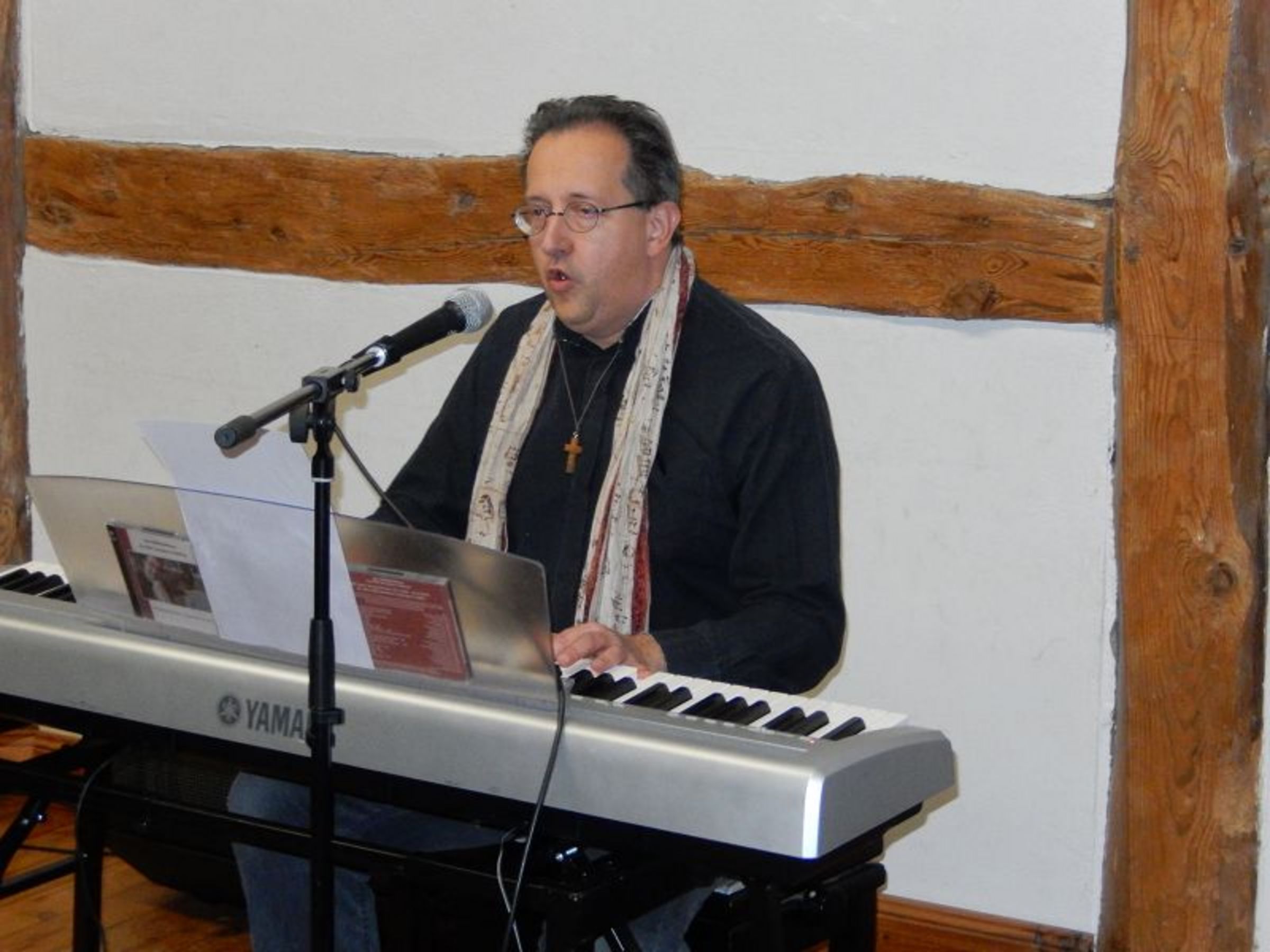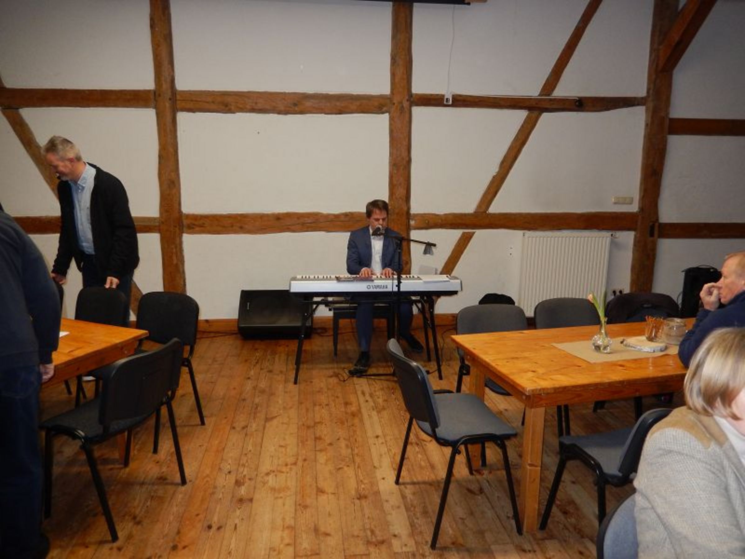 Ganz gleich ob Kirchenältester oder Gemeindebriefverteiler, ob Chormitglied oder Musiker im Posaunenchor: Alle waren eingeladen, mit einander fröhlich zu feiern. Als Dankeschön hatten die angestellten Mitarbeiter ein schönes Buffet hergerichtet. Wunderbar unterhaltsam Pastor Wolf "Amadeus" Fröhling aus Berlin-Zepernick, der am E-Piano ein musikalisches Feuerwerk mit Liedern von Georg Kreissler präsentierte. Schwarzer Humor, der den einen oder anderen Tränen lachen ließ.