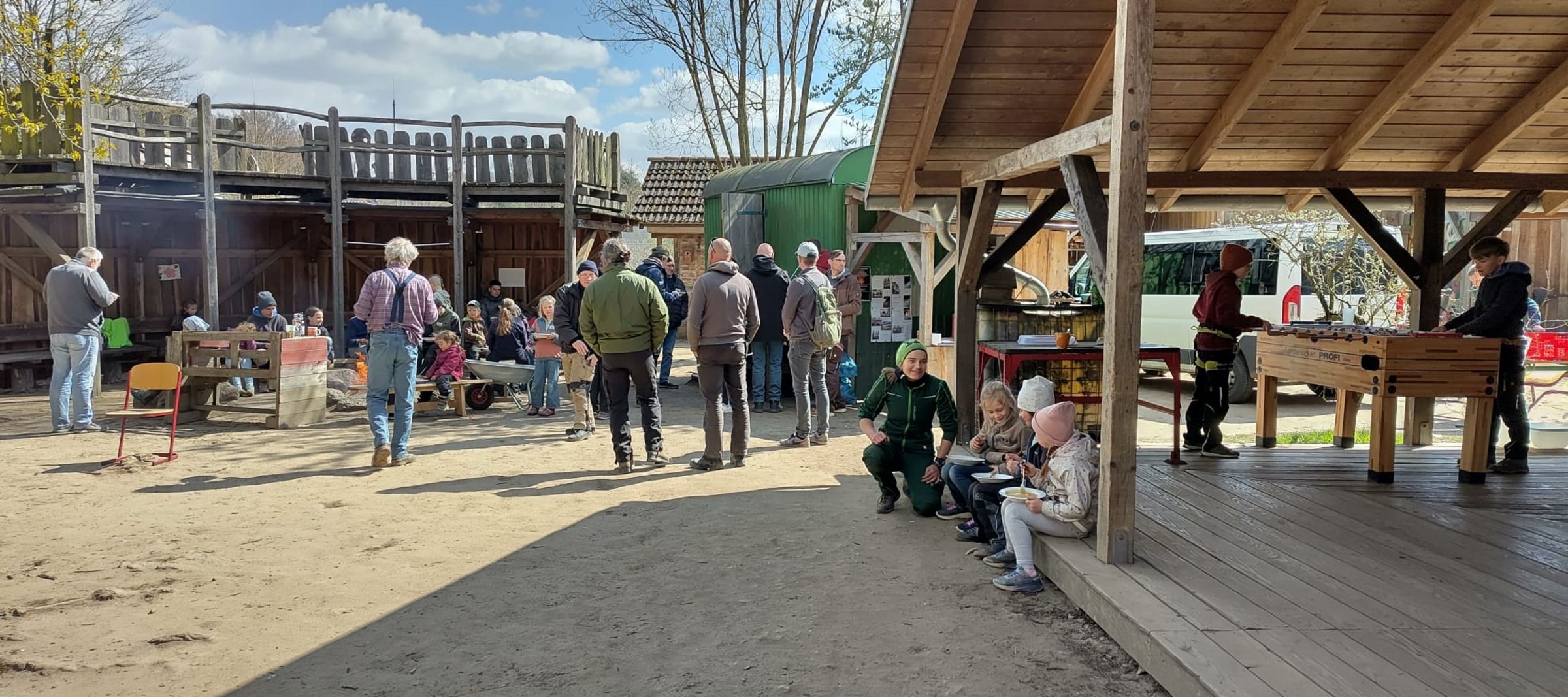 Heute war wieder einmal der "Vater-Kind-Tag". Auch einige Opas mit ihren Enkeln haben sich dieses Erlebnis nicht entgehen lassen. Wir waren zu Gast auf dem Bauspielplatz. Dort hatten wir Spaß beim gemeinsamen Kochen, beim Werkeln oder in Schwindel erregende Höhen zu klettern.