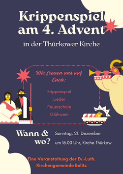 VeranstaltungKrippenspiel am 4. Advent 21.12.2025 · 16:00 Uhr · 17:00 Uhr Kirche ThürkowKirchsteig 17168 Todendorf Im Kalender speichern (.ics) Route berechnen zurück zur Übersicht der Veranstaltungen StartseiteGottesdienste und VeranstaltungenUnsere KirchenDorfkirche WarnkenhagenDorkirche LevitzowDorfkirche ThürkowFriedhofMiteinander - Füreinander JördenstorfÜber das ProjektAktuellesMitmachenKontaktFörderungSpendenKontakt und MitarbeitendeAnmelden