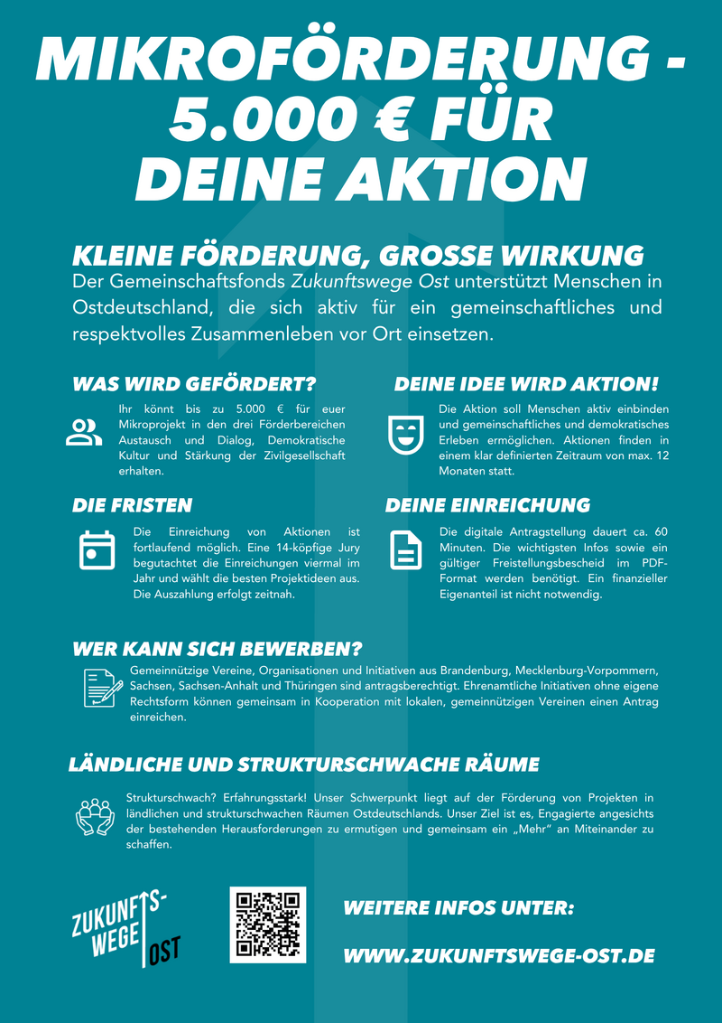 Dieses Projekt wird durch die Mikroprojekteförderung der Gemeinschaftsinitiative Zukunftswege Ost unterstützt. Die Förderung ermöglicht schnell und unkompliziert bis zu 5.000 € für Initiativen, die den Austausch im Dorf, demokratische Kultur oder Zivilgesellschaft stärken – und das ohne Eigenmittel.