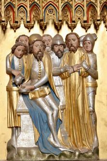 Als aber Pilatus sah, daß er nichts ausrichtete, sondern das Getümmel immer größer wurde, nahm er Wasser und wusch sich die Hände vor dem Volk und sprach: Ich bin unschuldig an seinem Blut; seht ihr zu!