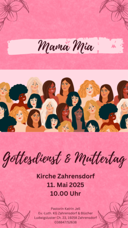 VeranstaltungMamma Mia! Gottesdienst zum Muttertag 11.05.2025 · 10:00 Uhr · 11:00 Uhr Kirche ZahrensdorfLudwigsluster Chaussee 19258 Zahrensdorf Im Kalender speichern (.ics) Route berechnen zurück zur Übersicht der Veranstaltungen StartseiteGottesdienste und VeranstaltungenPräventionskonzept - Kein Platz für sexuellen Missbrauch und GewaltMut fassen, sich mitzuteilenGruppen und KreiseAktueller GemeindebriefFriedhofKontakt und MitarbeitendeAnmelden