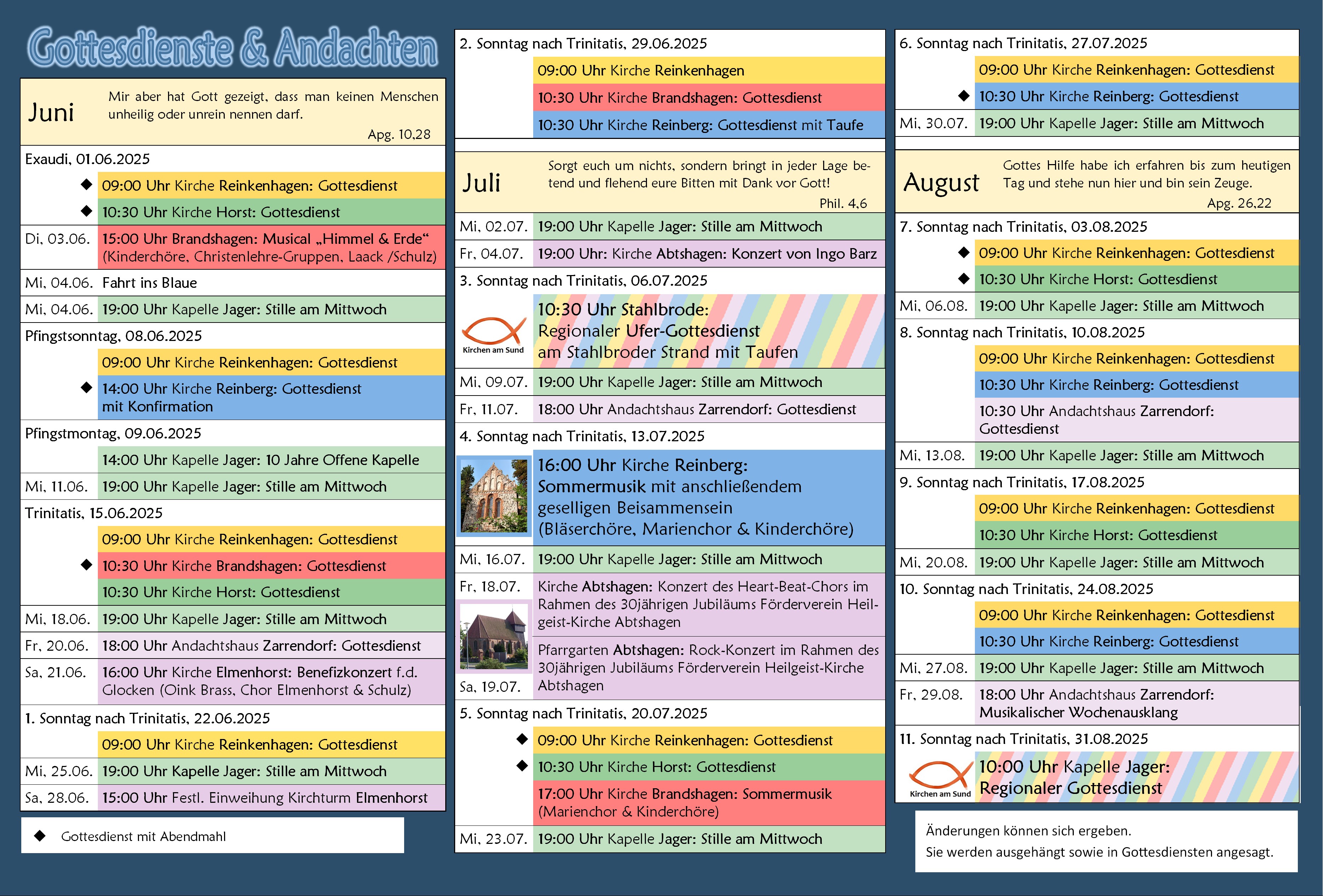 Im Gemeindebrief für den Pfarrsprengel "Kirchen am Sund" finden Sie alle Berichte, Informationen, Bilder und Termine der Kirchengemeinden Brandshagen, Reinberg, Horst, Reinkenhagen und Abtshagen-Elmenhorst . Die aktuelle Ausgabe gib es hier.