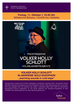 Saxophonist:in Volker Holly Schlott, Preisträger:in Deutscher Jazzpreis 2023, verwirklicht mit der aktuellen Saxophon-Klangreise, einem Solo-Programm mit dem Titel „warming sounds in cold days“, eine langgehegte Idee, die während des ersten Lockdowns März / April 2020 als persönliche