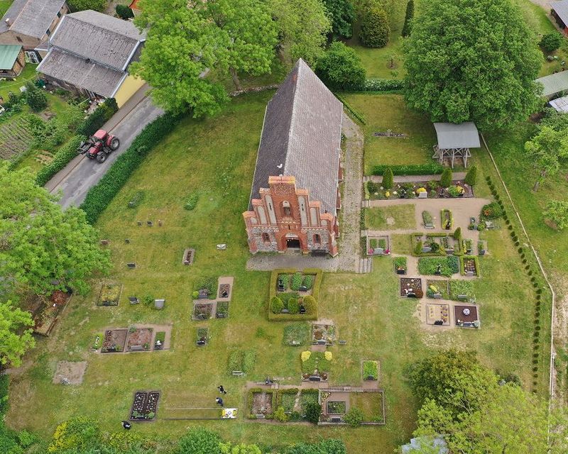 in der nordwestlichen Ecke des Friedhofs steht ein altes Kapellengebäude, das einst als Erbbegräbnis des Schlockower Gutes von 1855 erbaut wurde.