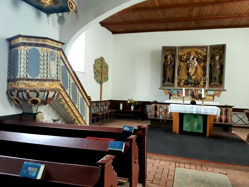 In unserer schönen Kirche in Gischow ist der Marienaltar ein ganz besonderer Schatz. Es ist ein Flügelaltar. In der Mitte die Mutter Jesu mit ihrem Kind auf dem Arm, als die gekrönte Himmelskönigin. Sie ist umgeben von Engeln und eingebettet in einen Strahlenkranz. So steht sie da und schaut in die Gemeinde, die sich betend vor ihr versammelt. Links und rechts von ihr, jeweils im Flügel des Altars, eine Figur. Wie ein Buch wirkt dieser Altar. Man kann ihn schließen. Und dann kann man die neuen Geschichten lesen. Geschichten, die aufgemalt wurden. Geschichten, die uns an den Anfang des Christentums führen. Sie sind durch die Jahre fast in Vergessenheit geraten. Der Flügelaltar steht auf einem Sockel, die Predella. Sie stellt eine ganze Bildergeschichte dar. Auch dieses Gesamtbild war sehr beschädigt. Mit Hilfe einer großzügigen Spende eines Ehepaares aus Halle/Saale und Eigenmitteln, konnte dieses wunderschöne Bild restauriert werden.