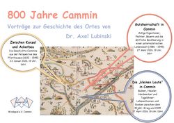 Anlässlich des 800. Jahrestages der urkundlichen Ersterwähnung von Cammin am 3. Juni 1226 und des 800 jährigen Dorfjubiläums von Cammin im Jahr 2026, gestaltet der Camminer Historiker Dr. Axel Lubinski eine Vortragsreihe zur Geschichte Cammins.