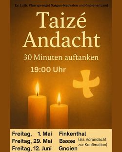 VeranstaltungTaize´Andacht Finkenthal 01.05.2026 · 19:00 Uhr · 20:00 Uhr Dorfkirche FinkenthalDorfstraße 17179 Finkenthal Im Kalender speichern (.ics) Route berechnen zurück zur Übersicht der Veranstaltungen StartseiteGottesdienste und VeranstaltungenRadwanderkirche SchorrentinGruppen und KreiseBesuchsdienstGemeindebriefeFriedhofKontakt und MitarbeitendeAnmelden