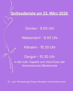VeranstaltungGottesdienst Gnoien 22.03.2026 · 09:00 Uhr · 10:00 Uhr Marienkirche GnoienAm Kirchenplatz 1117179 Gnoien Im Kalender speichern (.ics) Route berechnen zurück zur Übersicht der Veranstaltungen StartseiteGottesdienste und VeranstaltungenRadwanderkirche SchorrentinGruppen und KreiseBesuchsdienstGemeindebriefeFriedhofKontakt und MitarbeitendeAnmelden