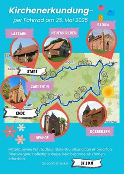 Wir beginnen nach dem Gottesdienst unsere Kirchenerkundung per Fahrrad, die uns von hier aus über die Kirchen in Neuenkirchen, Badow, Döbbersen und Neuhof bis nach Zarrentin führen wird.