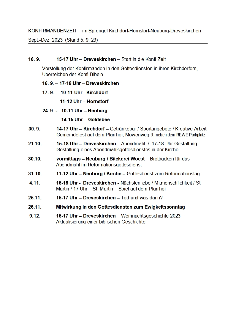 Ein Pastor, ein Gemeindpädagoge und eine Gemeindesekretärin arbeiten darin für die vier Gemeinden Dreveskirchen, Kirchdorf, Neuburg und Hornstorf. Diese 4 Gemeinden bilden ein Kirchspiel