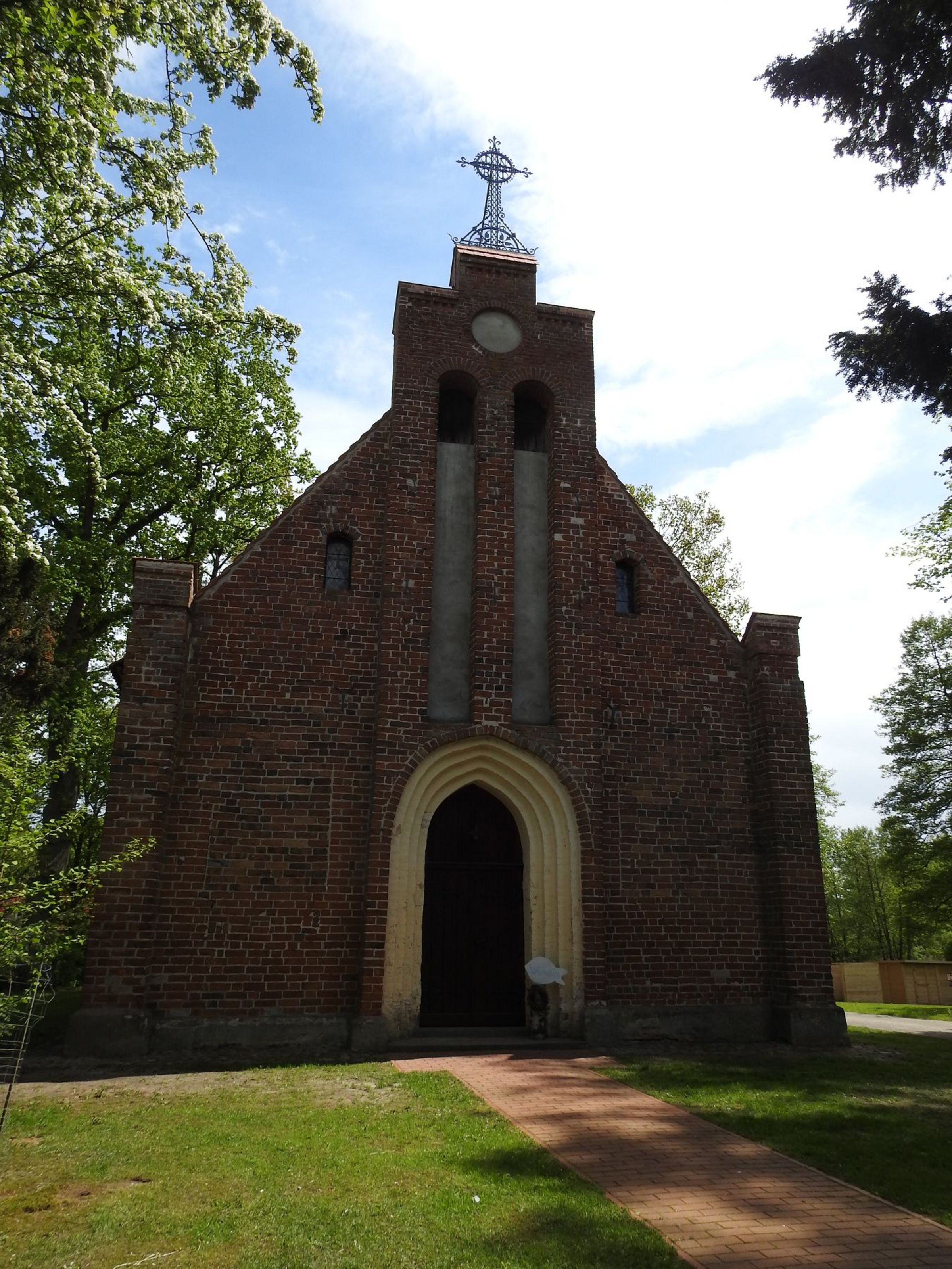 Die Kirche, die im 14./15. Jahrhundert erbaut wurde (ein dendrochronologisches Gutachten der Eichenbalken ergab eine Datierung ab 1451), ist ein einschiffiger Backsteinbau mit Chor. Kurios ist der Chorabschluss, dessen Rundung einer schiefen Ellipse entspricht. Statt mit einem Turm ist die Westseite mit einem pilasterförmig hervortretenden Mauerwerk und dem Eingangsportal versehen.