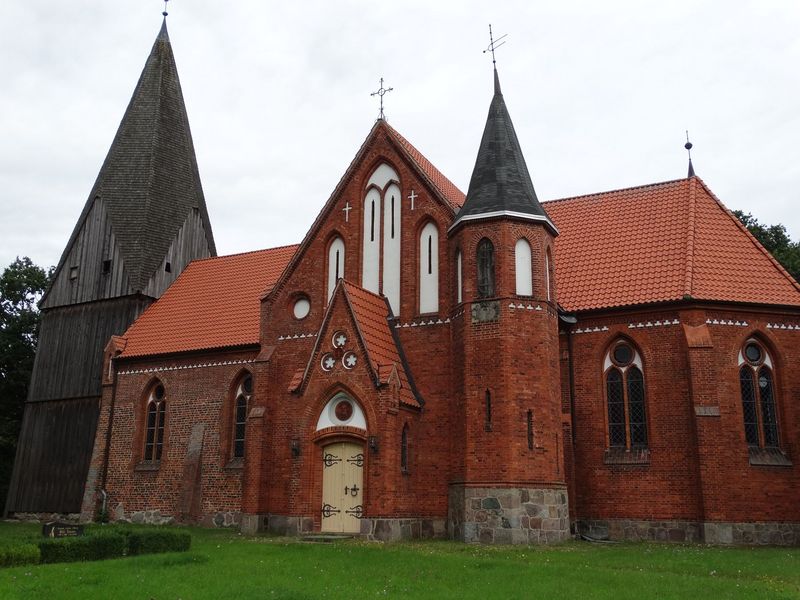 Die Kirche ist eine gotische Backsteinkirche mit Feldsteinsockel, deren Mittelschiff um 1450 entstand. Erweiterungen erfuhr das Bauwerk mit dem Holzturm um 1770 und um 1870 mit einem neuen Chorraum und dem Querschiff im Stil der Neugotik. Ebenfalls neugotisch ist die Inneneinrichtung.