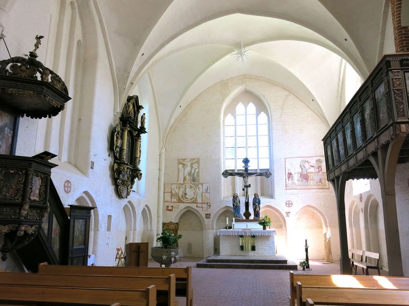 Steinhagen: Gotische Backsteinhallenkirche. Ersterwähnung 1283. Im Schatten des Klosters Neuenkamp (Franzburg) gegründet. Mittelalterliche Freskenmalerei an der Ostwand um 1380 ( Marien Krönung und Weltgericht), Triumphkreuzgruppe von Ende des15. Jh. als Altaraufsatz ( Kruzifix, Maria, Johannes). Barocke Malereien an den Emporen und der Kanzel (Leben Jesu, Leidensgeschichte, Hohes Lied der Liebe ) und Epitaph des Stifters der Malereien, Klinkowström, sowie Glocke aus der Zeit nach dem 30-jährigem Krieg. Granittaufstein 13. Jh. Mordwange, Ende 15. Jh. mit Ritzzeichnungen (der Ermordete, Weltgericht)