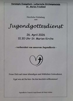 Die Jungendlichen unserer Gemeinde gestalten einen Gottesdienst für die ganze Gemeinde. Herzliche Einladung