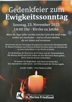 VeranstaltungGedenkfeier am Totensonntag in der Kirche zu Jatzke 23.11.2025 · 14:00 Uhr · 15:00 Uhr Kirche Jatzke Parkstraße 317098 Friedland Im Kalender speichern (.ics) Route berechnen zurück zur Übersicht der Veranstaltungen StartseiteGottesdienste und VeranstaltungenFriedhofGruppen und KreiseGemeindebriefeKontakt und MitarbeitendeAnmelden