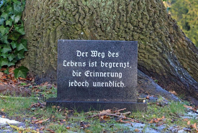 Hierzu wurde eine prächtige Eiche ausgewählt – siehe Bild rechts -, die für diese friedvolle Ruhestätte im Sommer einen breiten Schatten spendet. Die Urne wird in direkter Nähe des Baumstammes beigesetzt und die Grabstätte mit einer kleinen Steinplatte auf einem Sockel mit den Namensdaten gekennzeichnet.