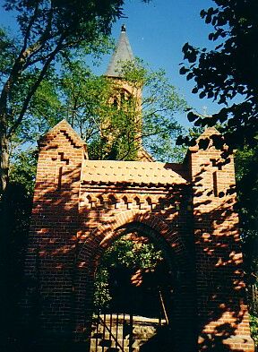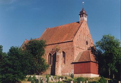 Bauliche Merkmale: Die neugotische Backsteinkirche wurde 1866 erbaut und liegt auf einer Anhöhe, umgeben von einem Friedhof. Sie misst bis zum First ein Höhe von 12 Metern, die noch um 7 m von dem schlanken, viergeschossigen Westturm mit einfachem Satteldach überragt wird. An das saalartige Schiff schließt sich eine polygonale Apsis an. An Chor und Schiff dominieren die kräftigen Strebepfeiler. Die hochgelegenen, großen Spitzbogenfenster enden in Höhe der Emporen, die sich an drei Seiten um das Schiff ziehen. Architektonisch originell ist der neue Gemeinderaum, der durch Glaswand und Tür 1993/94 vom Kirchenschiff abgetrennt wurde und sich unter der Empore befindet, auf der sich auch die Orgel findet. Die Orgel wurde 1887 von Friedrich. A. Mehmel aus Stralsund erbaut; 1999 erfolgte ihre gründliche Restaurierung durch den Orgelbauer Wolter aus Zudar/Rügen. Die Kanzel stammt wie der erste steinerne Altar aus dem Jahre 1866. Ein neuer, aus Pommerscher Eiche gefertigter Altar wurde 1999 aufgestellt. 2001 erfolgte die Renovierung der Rosette vom Eingangsportal.