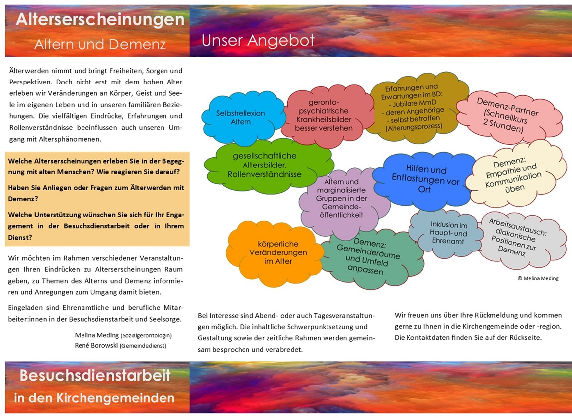 Wir möchten im Rahmen verschiedener Veranstaltungen Ihren Eindrücken zu Alterserscheinungen Raum geben, zu Themen des Alterns und Demenz informieren und Anregungen zum Umgang damit bieten.
