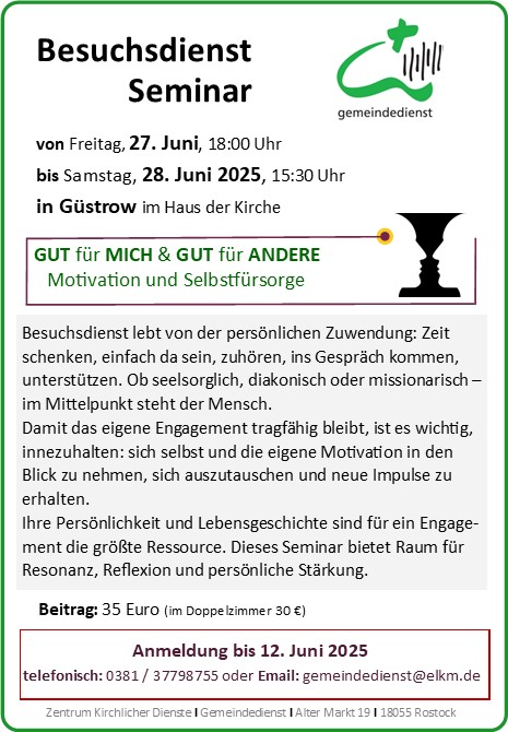 Der Bereich Gemeindedienst im Zentrum kirchlicher Dienste des Kirchenkreises Mecklenburg unterstützt und fördert die Besuchsdienstarbeit in Kirchengemeinden und Einrichtungen durch Ausbildung und Begleitung der Ehrenamtlichen.
