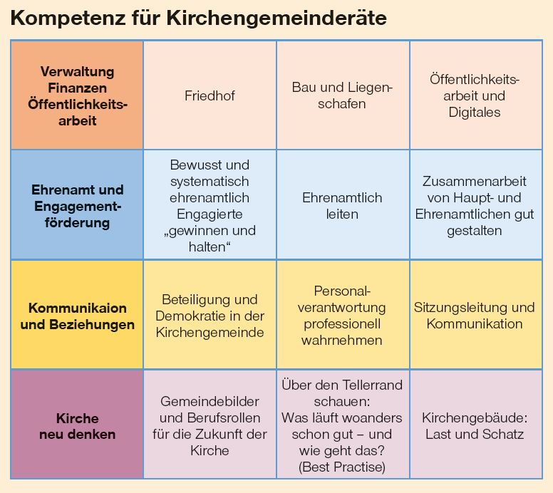 In dem Flyer Kompetenz für Kirchengmeinderäte finden Sie weitere Themenbereiche und Angebote. Sprechen Sie uns gerne an.