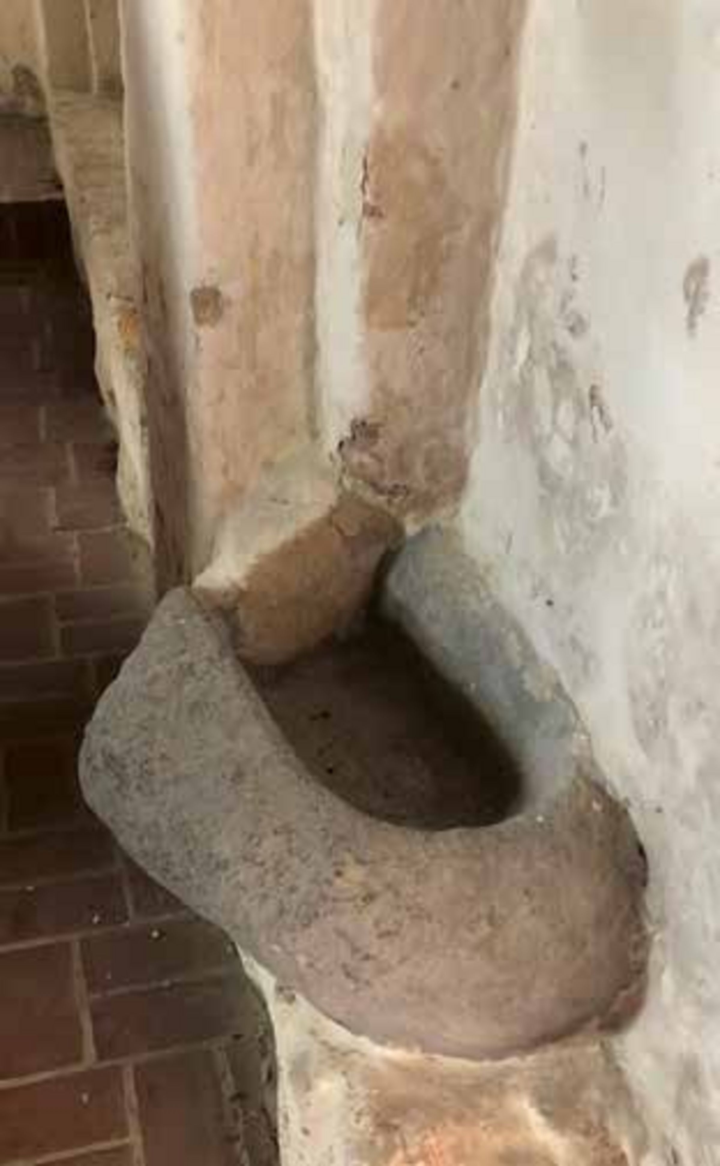 Ich möchte gerne auf eine Besonderheit in dieser Kirche aufmerksam machen. Rechts vom Eingang auf der Südseite sehen wir innen einen eingemauerten muldenförmigen Granitstein. Wir können davon ausgehen, dass bereits mit dem Bau der Kirche dieser Stein eingelassen wurde. Welchen Zweck sollte er erfüllen? Beim Betreten und Verlassen der Kirche wurde sich damals mit geweihtem Wasser bekreuzigt, das sich in einem Behältnis, dem Weihwasserbecken (Weihkessel), befand.