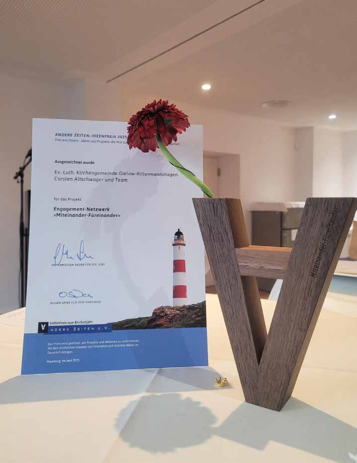 Liebe Gemeinde Gielow-Rittermannshagen, liebes Netzwerk „Miteinander-Füreinander“: Was Sie hier tun, ist mutig und österlich-hoffnungsvoll. Und deshalb sagen wir heute nicht nur: „Herzlichen Glückwunsch!“ Sondern auch: „Danke! Für Ihren Mut, Ihre Hoffnung, Ihr Engagement.“ Bleiben Sie dran. Gottes Segen dazu.