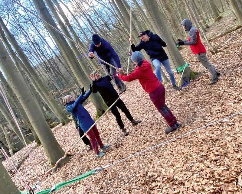 Am Nachmittag geht es wieder mit ungebremster Motivation in den Wald, jedes verfügbare Seil, jede Bandschlinge und jeder Karabiner kommt zum Einsatz. Jetzt werden Hilfsseilanlagen gebaut und es kommt zum wilden Tauschhandel mit Material zwischen den verschiedenen Baustellen (das Einsortieren in die Kisten kann nachher spannend werden…). Besonders beeindruckend war zu sehen, wie schnell wir als Team funktionierten und wie kreativ die verschiedenen Elemente gestaltet wurden. Henning hat nicht nur einen kritischen Blick, sondern auch so manche Geschichte im Nähkästchen. Wir bekommen viele Tipps, wie wir die Stationen verbessern und später anleiten können und mit welchen Hilfsmitteln das Überqueren je nach Körpergefühl und Gleichgewicht auf dem Seil leichter oder herausfordernder gemacht werden kann.