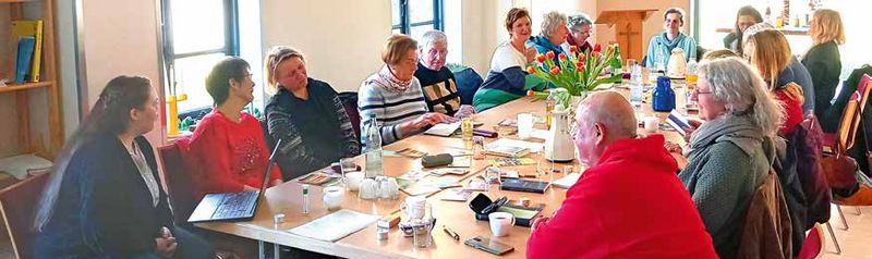 In dem hellen Gemeinderaum wurde mit dekorativ vorbereitetem, breit gefächertem Infomaterial und verschiedenen Getränken eine sehr einladende Atmosphäre geschaffen. Zusammen mit den Pausenangeboten – angefangen von einem kurzen Spaziergang zum See über den Mittagsimbiss bis hin zur Einladung zur Kirchenbesichtigung – bildete dies einen rundum gelungenen Rahmen. Spätestens nach der doch sehr emotionalen Eröffnungsrunde war das Eis unter den Kursteilnehmenden gebrochen. Dieser Beginn zeigte: Egal, wie lange der individuelduell le Abschied von einem geliebten Menschen schon vergangen ist, es bleibt doch immer eine sehr bewegende Erfahrung, über die oft kaum oder viel zu wenig gesprochen wird.