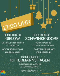 VeranstaltungGottesdienst mit Krippenspiel 24.12.2025 · 17:00 Uhr · 18:00 Uhr Dorfkirche SchwinkendorfDorfstraße 8917194 Schwinkendorf Im Kalender speichern (.ics) Route berechnen zurück zur Übersicht der Veranstaltungen StartseiteGottesdienste und VeranstaltungenGemeindebriefe2024202320222021GemeindelebenAktuellesRückblickeProjekteTermineVereine und InitiativenKommune BasedowKommune FaulenrostKommune GielowKommune MoltzowKommune PeenehagenKommune ZetteminKirchen - Bilder und InformationenKirche Alt SchönauKirche BasedowKirche DuckowKapelle GessinKirche GielowKirche Groß GievitzKirche LansenKirche RambowKirche RittermannshagenKirche SchwinkendorfWüstekirche DomherrenhagenKirche ZetteminFriedhöfeSpenden und UnterstützenSchutz und BeratungSchutzkonzept gegen sexualisierte GewaltKontakt und MitarbeitendeAnmelden