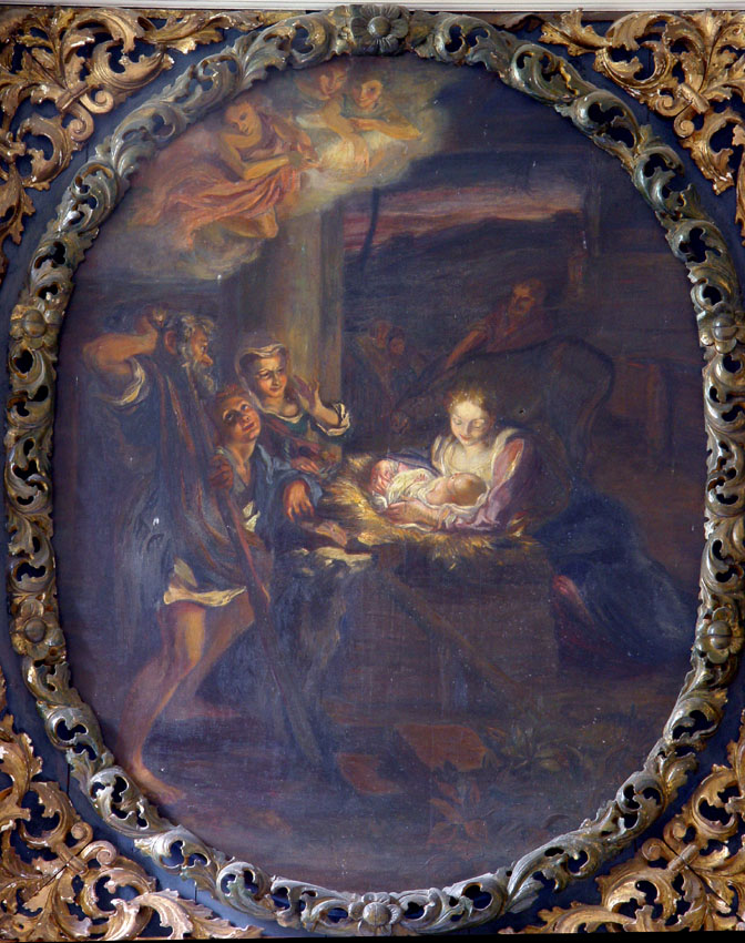 Dargestellt sind als Hauptszene im Mittelfeld die Anbetung des Kindes, in der Predellenzone darunter Petri Fischzug, in den Medaillons der Seitenwangen Christus bei der Kreuztragung und als Guter Hirte mit dem Schaf auf der Schulter sowie ein drittes Mal im Aufsatz als Weltenrichter (im Dehio steht „Auferstehung“).Bekrönt wird das Ganze von der Skulptur eines Posaune blasenden Engels mit einem Palmzweig in der anderen Hand. Bei den beiden das Rundbild mit dem Weltenrichter flankierenden sitzenden Figuren handelt es sich offenbar um Evangelisten. Man könnte sich gut vorstellen, daß ehemals zwei weitere Evangelistenfiguren außen auf dem kräftigen Gebälk über dem Hauptgeschoss standen, welches von zwei mit Laubwerk belegten gedrehten Säulen getragen wird. Die Form der Säulen geht zurück auf die Säulen der Kathedra Petri in Rom, jedoch war diese Form um 1700 in Architektur und Möbelkunst allgemein verbreitet – es dürfte sich kaum um eine bewusste Rezeption handeln.