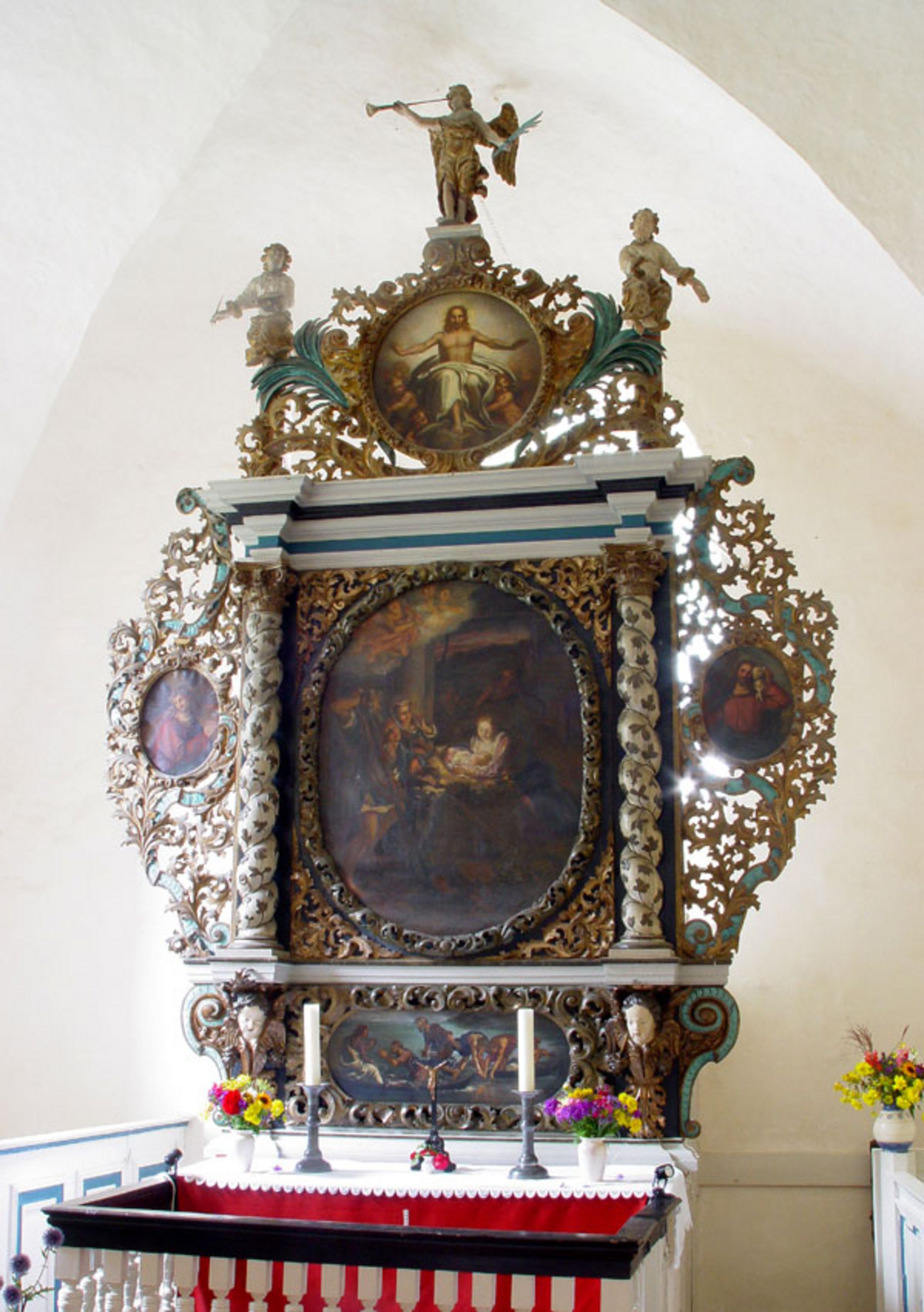 Auf dem Altar steht ein filigran durchbrochener großer barocker Aufsatz, der dem Ornament nach ins erste Drittel des 18. Jahrhunderts zu datieren sein dürfte. Das Licht des dahinter liegenden Chorfensters bricht durch die Ranken aus Akanthusblättern und das Bandelwerk der Seitenwangen und der Bekrönung des Altarretabels.