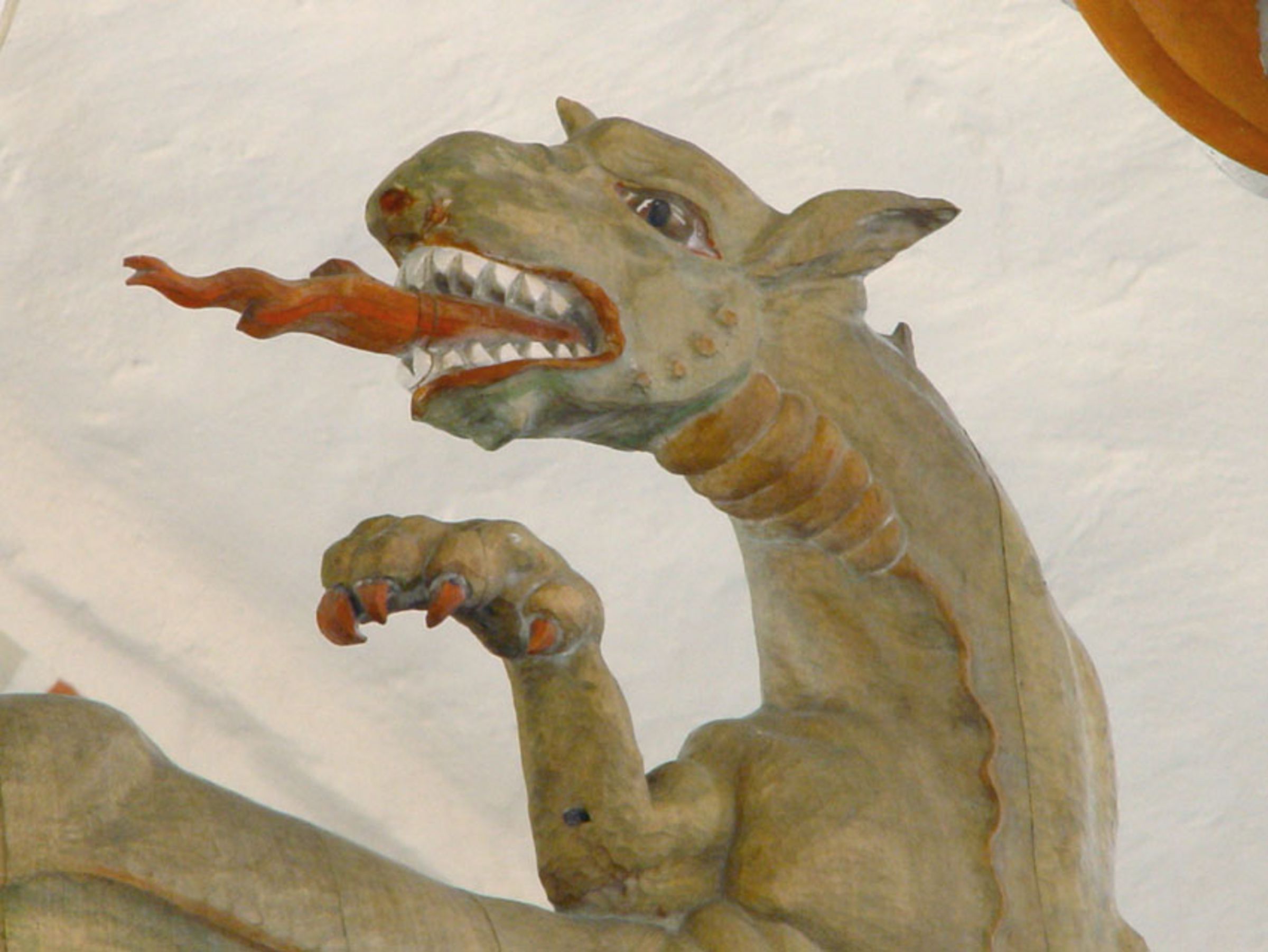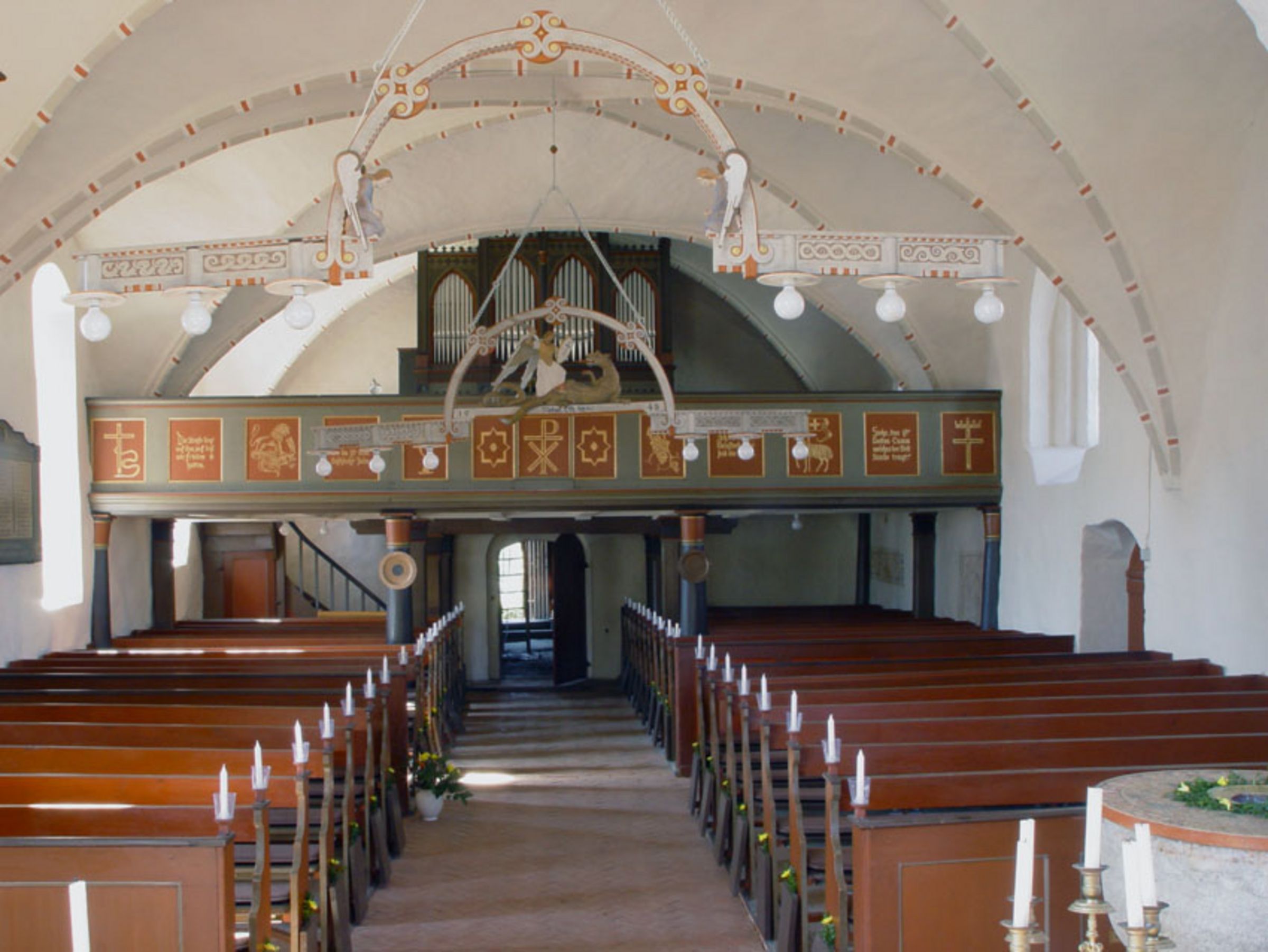 Von den beiden Leuchtern über dem Mittelgang zeigt einer mit der Jahreszahl 1948 den Kampf des Erzengels Michael gegen den Drachen. Gestiftet wurde dieser Leuchter von Pastor Behrendt. Als Motto wählte er aus dem 56. Psalm: „Ich habe dir, Gott, gelobt, dass ich dir danken will. Denn du hast mich vom Tode errettet, meine Füße vom Gleiten, dass ich wandeln kann vor Gott im Licht der Lebendigen.“ (Psalm 56.13,14) Worauf spielt der Drachenkampf an? Der zweite Leuchter mit den betenden und dankenden Engeln ist eine Stiftung des damaligen Besitzers der Bürstenfabrik.