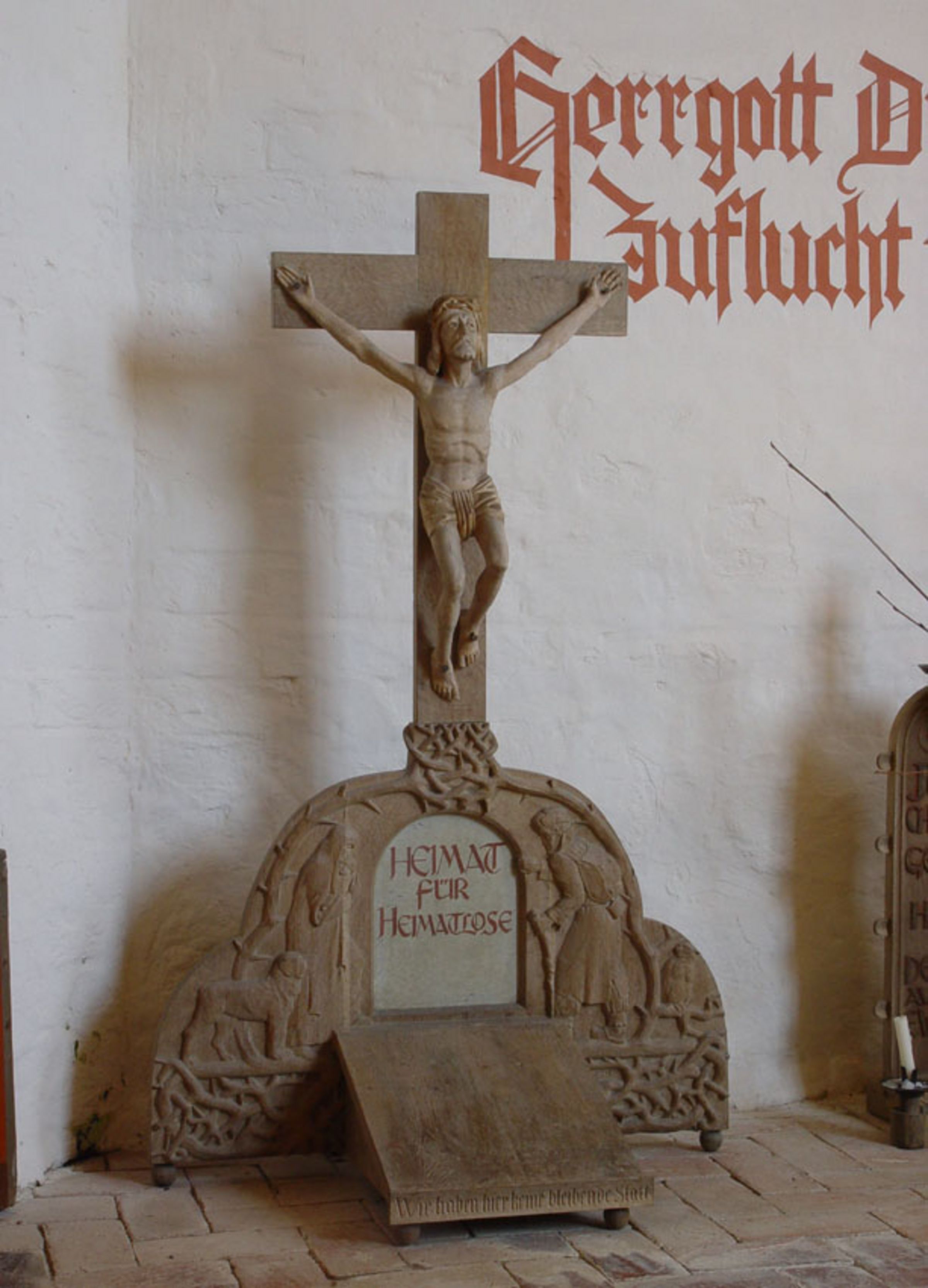 Unter dem Elmenhorster Kreuz steht in einer portalartigen Arkade „Heimat für Heimatlose“. Ein Mann und eine Frau mit einem Kind auf dem Arm nähern sich unter Dornen dieser Zuflucht. Der Mann in schwerem Mantel, den Tornister auf dem Rücken, am Gürtel ein Essgeschirr, in der Hand einen Wanderstab. Ikonographisch erinnert die Szene an die Flucht der Heiligen Familie, an Maria und Joseph. Ein großer Hund ist mit dabei, auf der anderen Seite sitzt eine Eule.