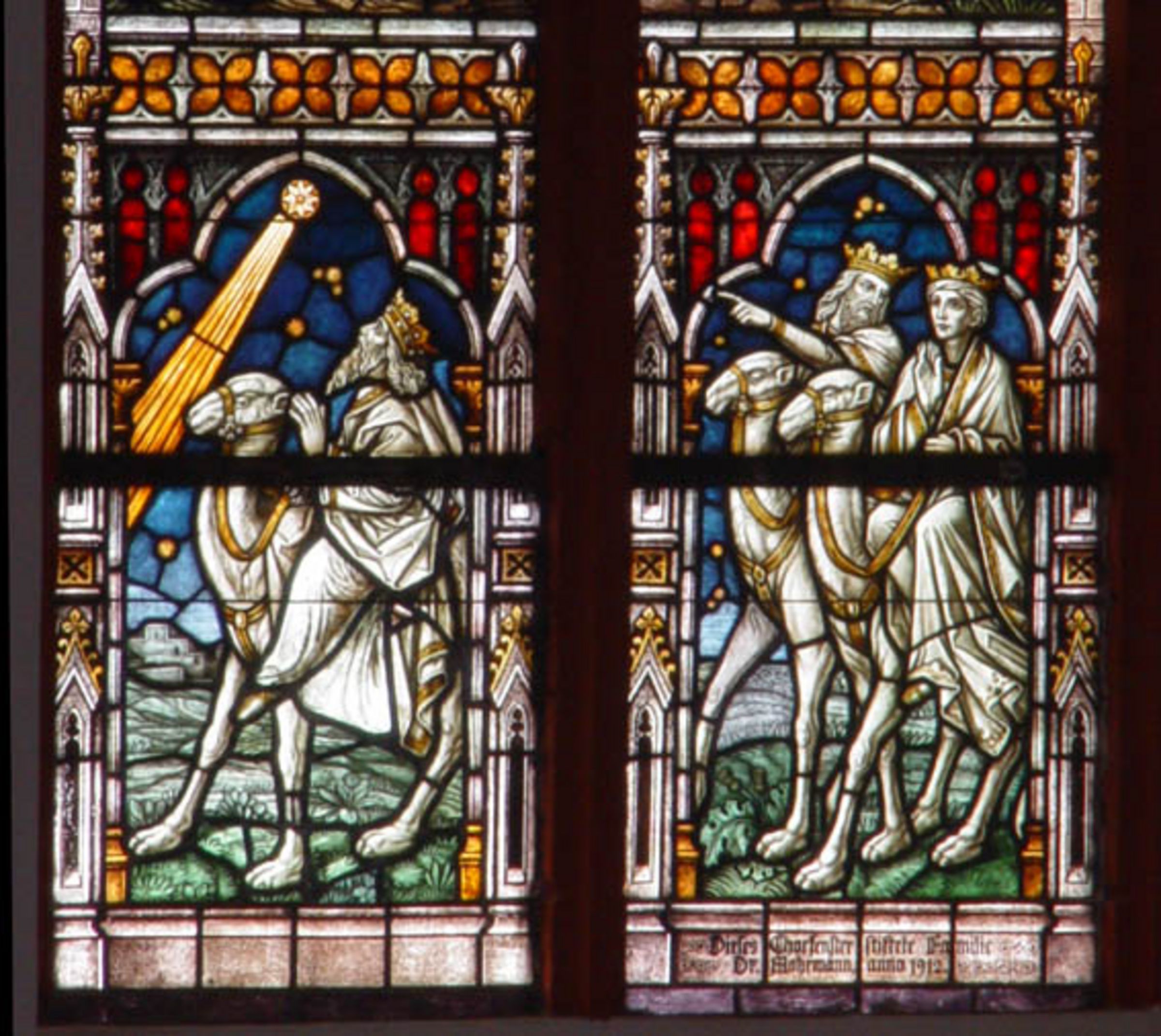 Das Fenster im Chorscheitel zeichnet sich durch eine zusätzliche Szene im unteren Bereich aus, dort, wo auf den anderen beiden Bildern unter reichen Wimpergen Vorhänge drapiert sind. Dargestellt ist der Weg der Heiligen Drei Könige, die dem Schweifstern am Firmament folgen. Voran der älteste, gefolgt von den beiden jüngeren auf ihren behäbigen Wüstenschiffen. (vgl. auch Heilige Drei Könige Altefähr) Die Könige und ihre Reittiere sind in Grisailletechnik, in Graumalerei, wiedergegeben. Nur Kronen, Gewandsäume und das Zaumzeug der Kamele heben sich golden ab. Links unten befindet sich die Inschrift „Dieses Fenster stiftete Familie Dr. Mohrmann, anno 1912“.