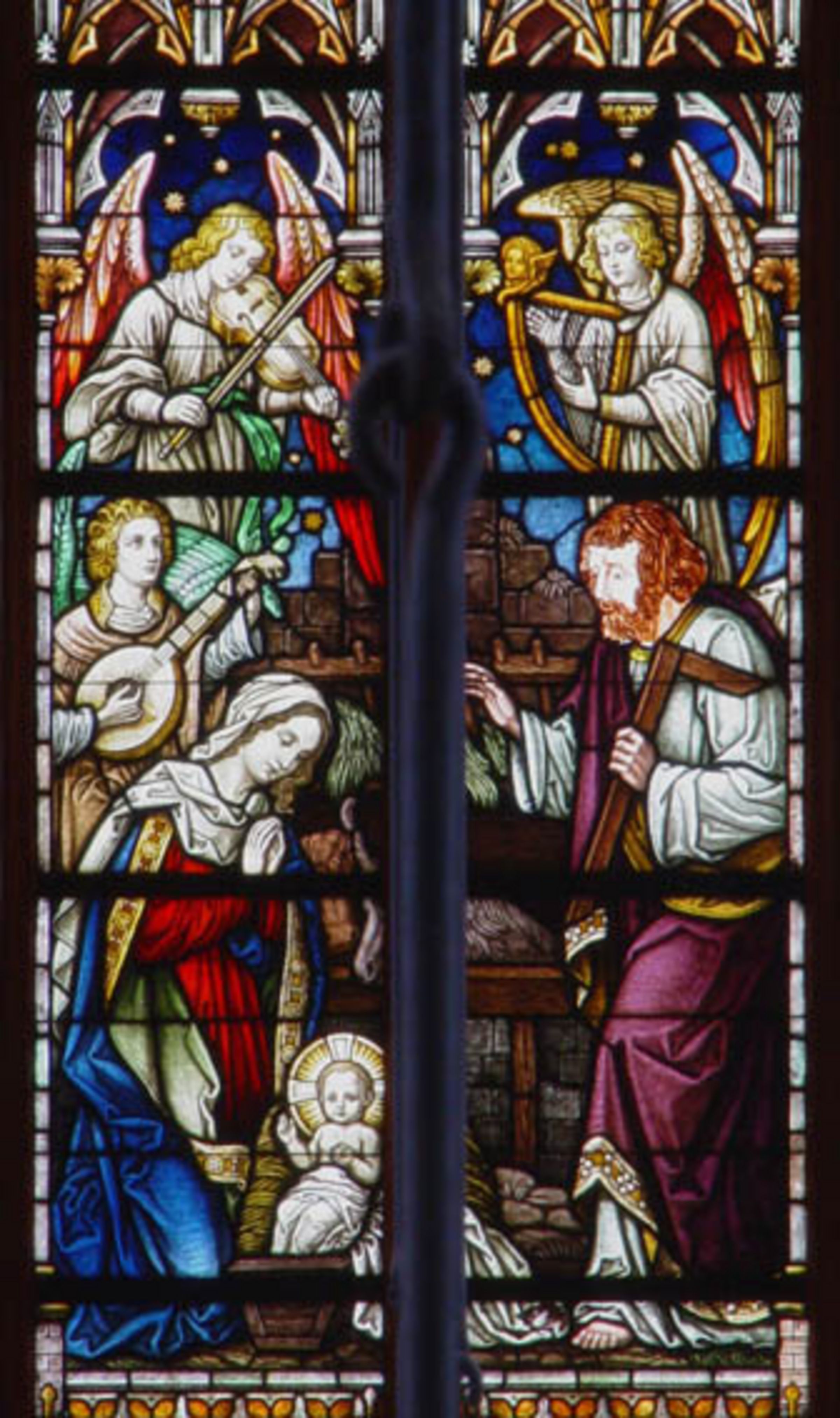 Das Kleid Marias ist weiß wie die neben ihr stehende Madonnenlilie als Symbol der Unschuld. Ihr blauer Mantel verweist auf die Himmelskönigin. Nicht nur Farben und Attribute, auch die Fältelung der Gewänder folgt spätmittelalterlichen Vorbildern. Das Gewand Gabriels macht das Heranrauschen des Engels sinnfällig. In der Linken hält er ein Zepter, um das sich das Band mit seiner Botschaft „Ave Maria gratia plena...“ schlingt. Ein Leuchter mit drei Kerzen verweist auf die heilige Dreifaltigkeit. Eine Stiftungsinschrift fehlt auf dem Verkündigungsfenster. Das Weihnachtsbild darüber zeigt Maria und Joseph vor dem Kind und drei musizierende Engel. Einer hat eine Laute, einer eine Harfe und einer eine Geige. Joseph hält als Attribut des Zimmermanns ein Winkelmaß in der Hand. Ochs und Esel sind von den Fensterpfosten und Stegen weitgehend verdeckt.