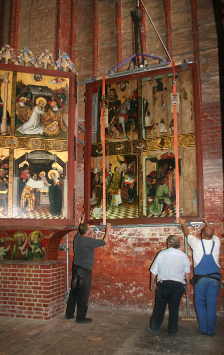 Unter der Leitung des Restaurators Andreas Mieth haben der Wismarer Gerüstbauer Marco Lenschow und zwei seiner Mitarbeiter dazu hinter dem Altar eine Konstruktion errichtet, an der die beiden schweren Malflügel in einer aufwändigen Aktion in ihrer ursprünglichen Position montiert wurden.