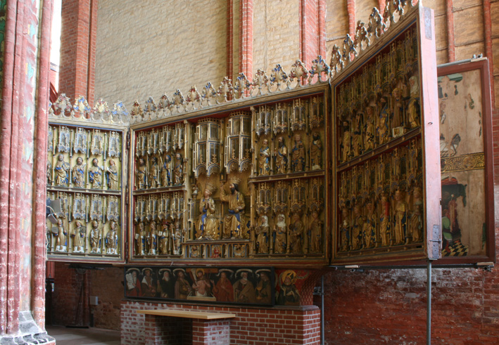 Das um 1430 entstandene Hochaltarretabel der Wismarer St. Georgenkirche ist mit zehn Metern Breite bei geöffneten Flügeln das größte seiner Art im gesamten Ostseeraum.