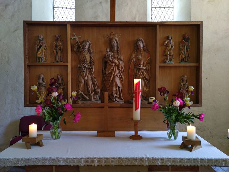 Im linken Flügel oben stehen die Heiligen Petrus und Paulus. Darunter Margarete mit einem Drachen und Katharina mit einem Schwert, mit dem sie enthauptet worden ist. Im rechten Flügel oben Ritter Georg, der Drachentöter, und Jakobus mit einem Pilgerhut. Darunter Maria Magdalena mit einem Salbgefäß. Die achte Figur fehlt.