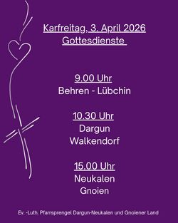 VeranstaltungGottesdienst Karfreitag Dargun 03.04.2026 · 10:30 Uhr · 11:30 Uhr Pfarrkirche DargunRöcknitzstraße 17159 Dargun Im Kalender speichern (.ics) Route berechnen zurück zur Übersicht der Veranstaltungen StartseiteGottesdienste und VeranstaltungenGruppen und KreiseGemeindebriefeFriedhofKontakt und MitarbeitendeAnmelden