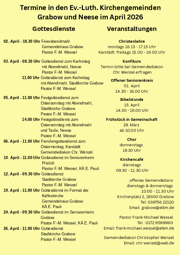 StartseiteAktuell mit PfarrstellenausschreibungGottesdienste und VeranstaltungenGottesdienste und Veranstaltungen im März 2026VeranstaltungenProgramm April 2026Schutzkonzept/PräventionSonderausstellung zur Erinnerung an den Stadtbrand vor 300 JahrenGruppen und KreiseGemeindebrief aktuell und ArchivFriedhofKontakt und MitarbeitendeAnmelden