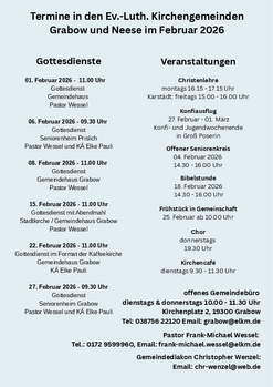 ansehen herunterladen ansehen herunterladen StartseiteAktuell mit PfarrstellenausschreibungGottesdienste und VeranstaltungenVeranstaltungenProgramm Februar 2026Schutzkonzept/PräventionSonderausstellung zur Erinnerung an den Stadtbrand vor 300 JahrenGruppen und KreiseGemeindebrief aktuell und ArchivFriedhofKontakt und MitarbeitendeAnmelden