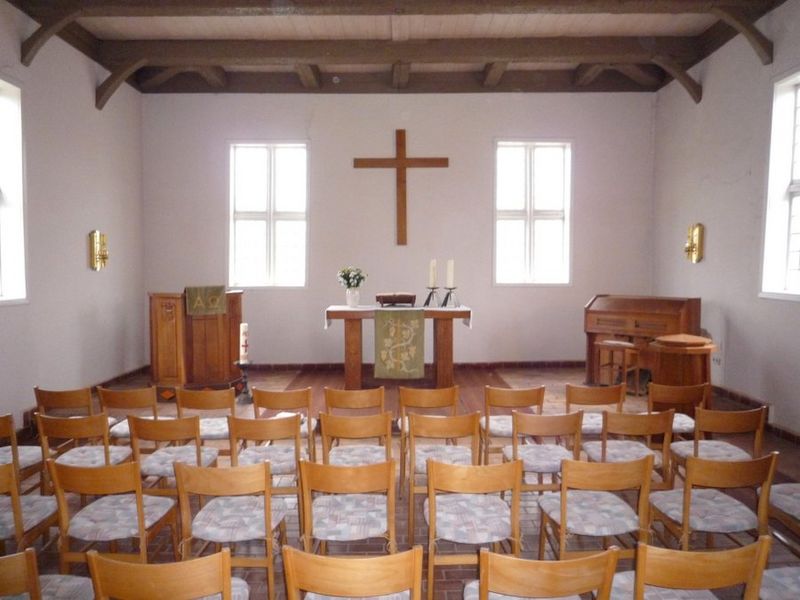 Man betritt die Kirche durch eine Tür an der Südseite und kommt in einen weißen, lichten Innenraum. Durch die hohen bleiverglasten Fenster und die Wandleuchten aus Messing hat er den Charakter eines hellen festlichen Raumes. An der Westseite wurde ein schmaler Raum abgeteilt, durch den man über eine Treppe auf die Empore gelangt. Altar und Kanzel sind bei einem Brand in 50iger Jahren vernichtet worden und durch schlichte, geschnitzte Stücke ersetzt. Auf dem Altar, der nur aus einem massiven Tisch besteht, befinden sich zwei neue Messingleuchter. Als Osterleuchter wird ein alter getriebener Messingleuchter genutzt. Ein einfaches großes Holzkreuz schmückt die Ostwand hinter dem Altar. Das einst klangvolle Harmonium, ist seit 2013 außer Betrieb und wartet auf eine Reparatur, um die kirchlichen Gesänge wieder unterstreichen zu können.