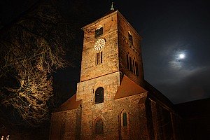 Über der Stadtkirche St. Nikolai Kirche hält der Mond Nachtwache. In der Eingangshalle der Kirche erklingen Werke des 16. bis 21. Jahrhunderts, dazu passend literarische Leckerbissen und ein Glas Rotwein bei Kerzenschein.
