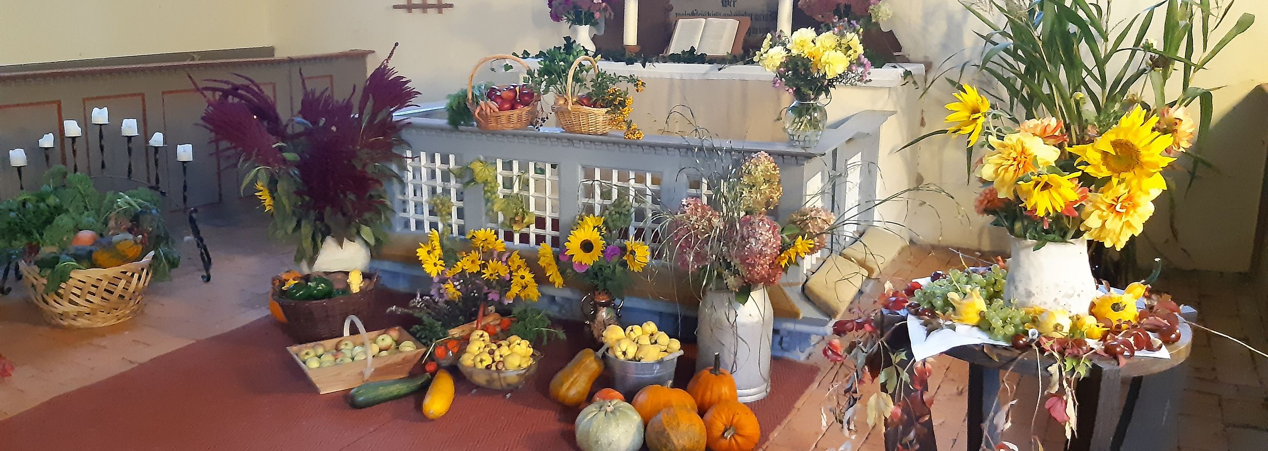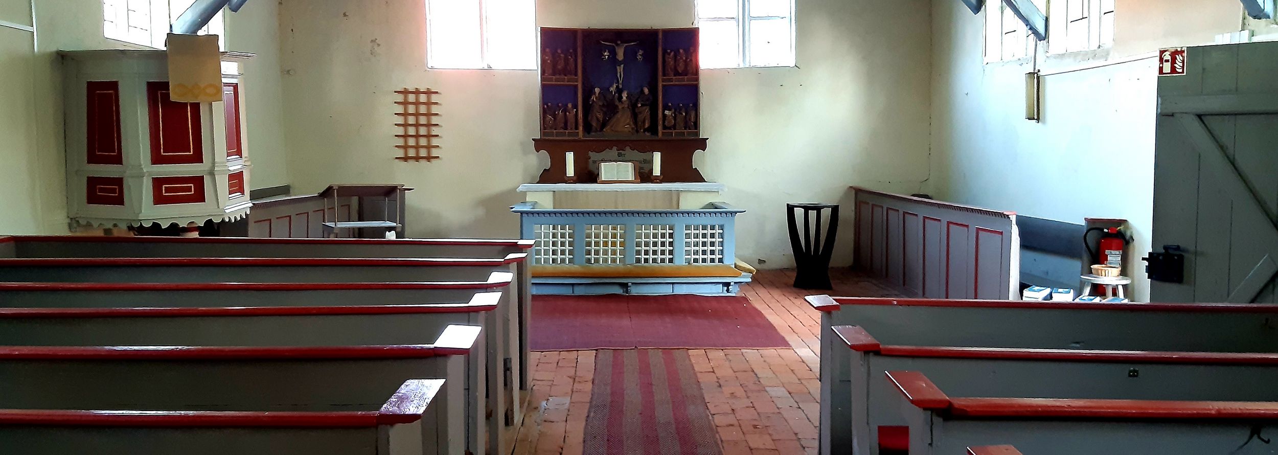 Schlichte Inneneinrichtung: Altartriptychon mit Schnitzfiguren, Mittelteil mit Kreuzigungsszene, in den Seiten je zweimal drei Apostelfiguren, in der Predella Abendmahlspruch (um 1535).